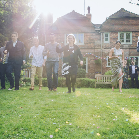 The garden party reception was a fun, joy-filled affair, with perfect weather, confetti and quirky garden games. The whole garden was made use of, with a marquee and pop-up bar still leaving plenty of room for running around and relaxation. Egg and spoon races, scavenger hunt and (inflatable) sheep racing sprang from Sam's drama teacher silliness as an important aspect of the day (having children as guests also helped with the laid-back fun vibes). In the marquee, DIY 'Botanical' themed decor sat perfectly with the idyllic garden location. An amazing vegan spread was supplied by Vegan Food Pimp and copious dessert table by Glitterbug Bakery.